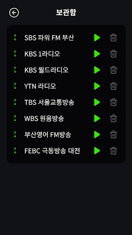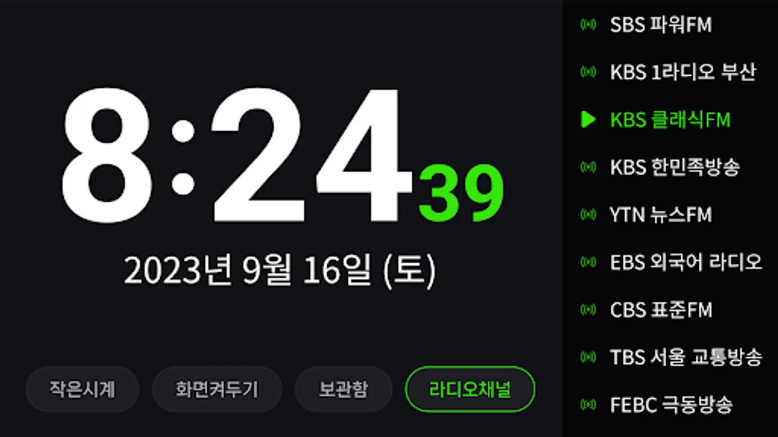 KBS 1 Radio, KBS 2 Radio Happy FM, KBS 3 Radio, KBS Classic FM, KBS Cool FM, KBS Korean Broadcasting, KBS World CH1, KBS World CH2, KBS World Music, MBC Standard FM, MBC FM4U, SBS Power FM, SBS Love FM, FEBC Far East Broadcasting, BBS Buddhist Broadcasting, BTN Buddhist Broadcasting, CPBC Peace Broadcasting, WBS Original Sound Broadcasting, OBS Gyeongin FM, Gyeongin Broadcasting iFM, CBS Standard FM, CBS JOY4U, YTN News FM, EBS FM Radio, EBS Foreign Language Radio, TBS Traffic Broadcasting FM, Korean traditional music FM, National Defense FM, AFN FM, Arirang Radio, community radio, Gwangju English eFM, Busan English eFM, Radio Korea AM, Radio Seoul AM, RFA Free Asia Broadcasting