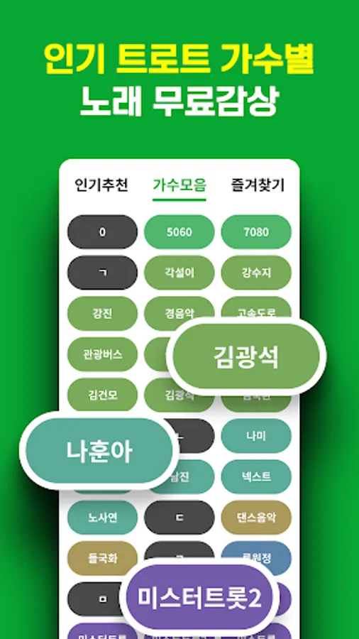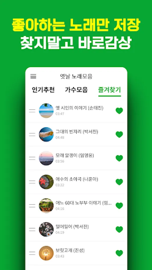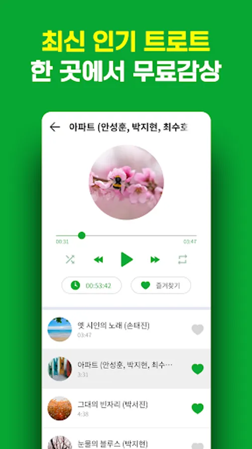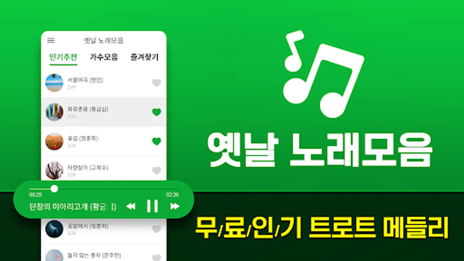 Even if you do not register as a member, anyone can listen to 'old songs that have flowed' and 'latest trot'. When walking, exercising, fishing, or driving, high-quality music plays well even when the screen is turned off.