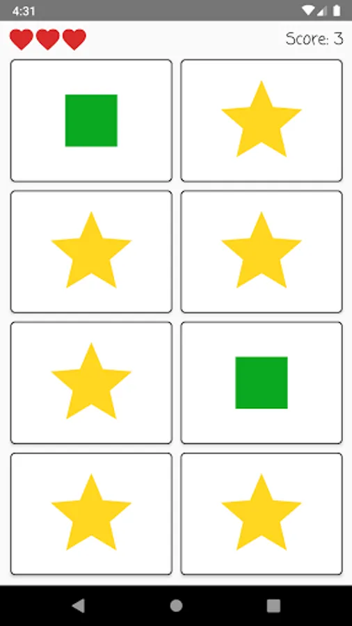 Memory Run adds a little twist to the familiar memory game we all know and love: Instead of trying to outdo an opponent, your objective will be to solve as many sets as possible. Every mistake you make will cost you a life, and if you run out of lives, the game will be over! Don't worry, though; you'll be given 3 seconds to look over all the cards before you begin a set. Also, you'll be awarded lives for each set you complete. The exact number you get varies depending on your difficulty setting.