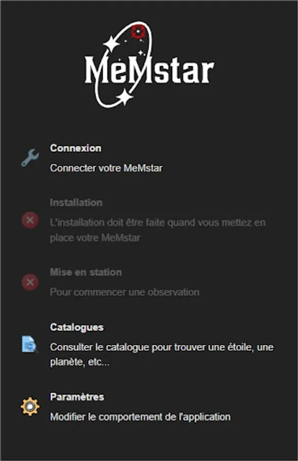 The MeMstar application allows you to connect to the MeMstar box. It gives you access to over 15,000 stellar objects including planets, Messier catalog, NGC and named stars.
