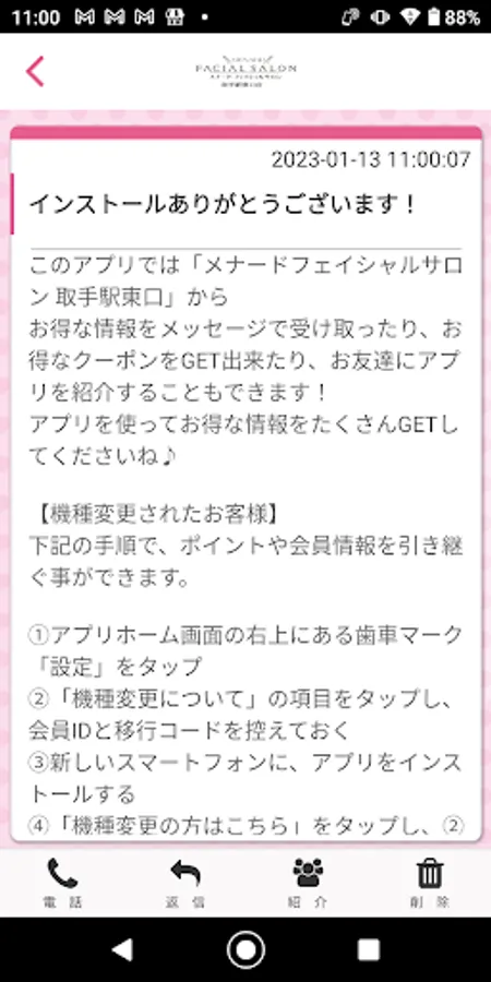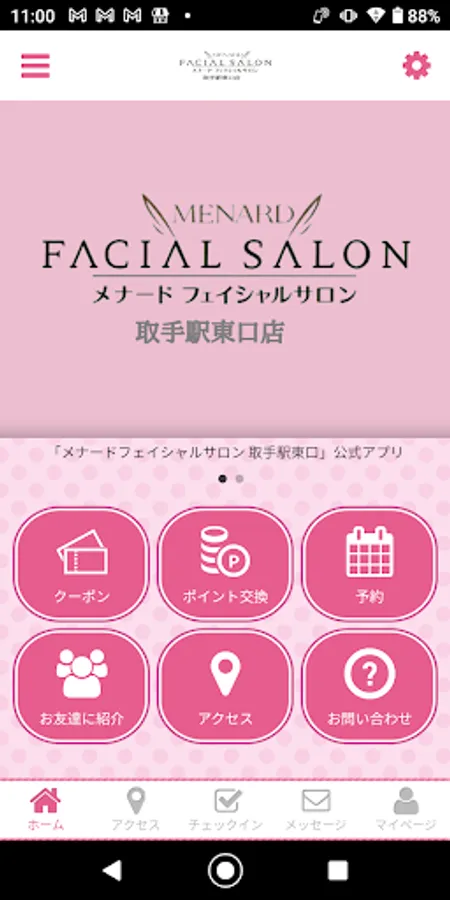 Menard Facial Salon You can introduce the app in east exit of Toride Station to your friends through SNS.