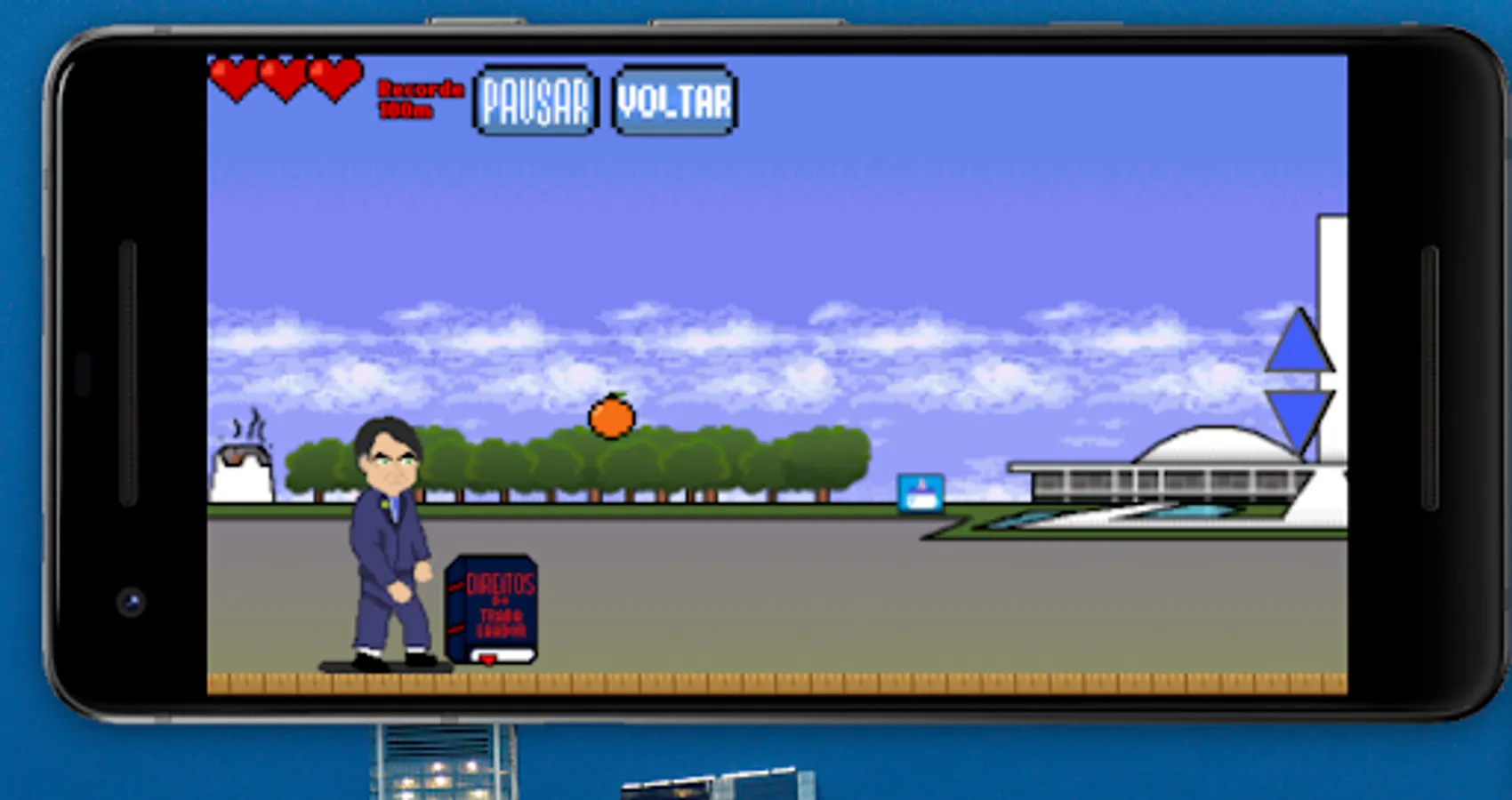 You can jump or duck to avoid obstacles getting in your way. They say that oranges help you move on!