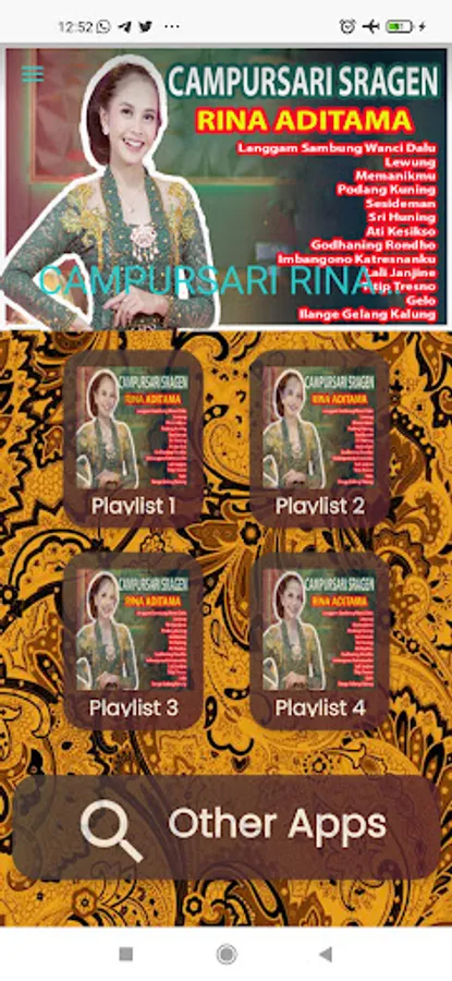 CAMPURSARI RINA ADITAMA SRAGENAN is a Campursari Sragenan Mp3 Offline application that is much liked by Campursari Sragenan Offline fans. The Campursari Sragen Rina Aditama application is very light and easy to download because the Campursari Rina Aditama Sragenan Song application is small in size, the Campursari Rina Aditama application is very easy to play with 4 offline playlists that you can search and play at will.
