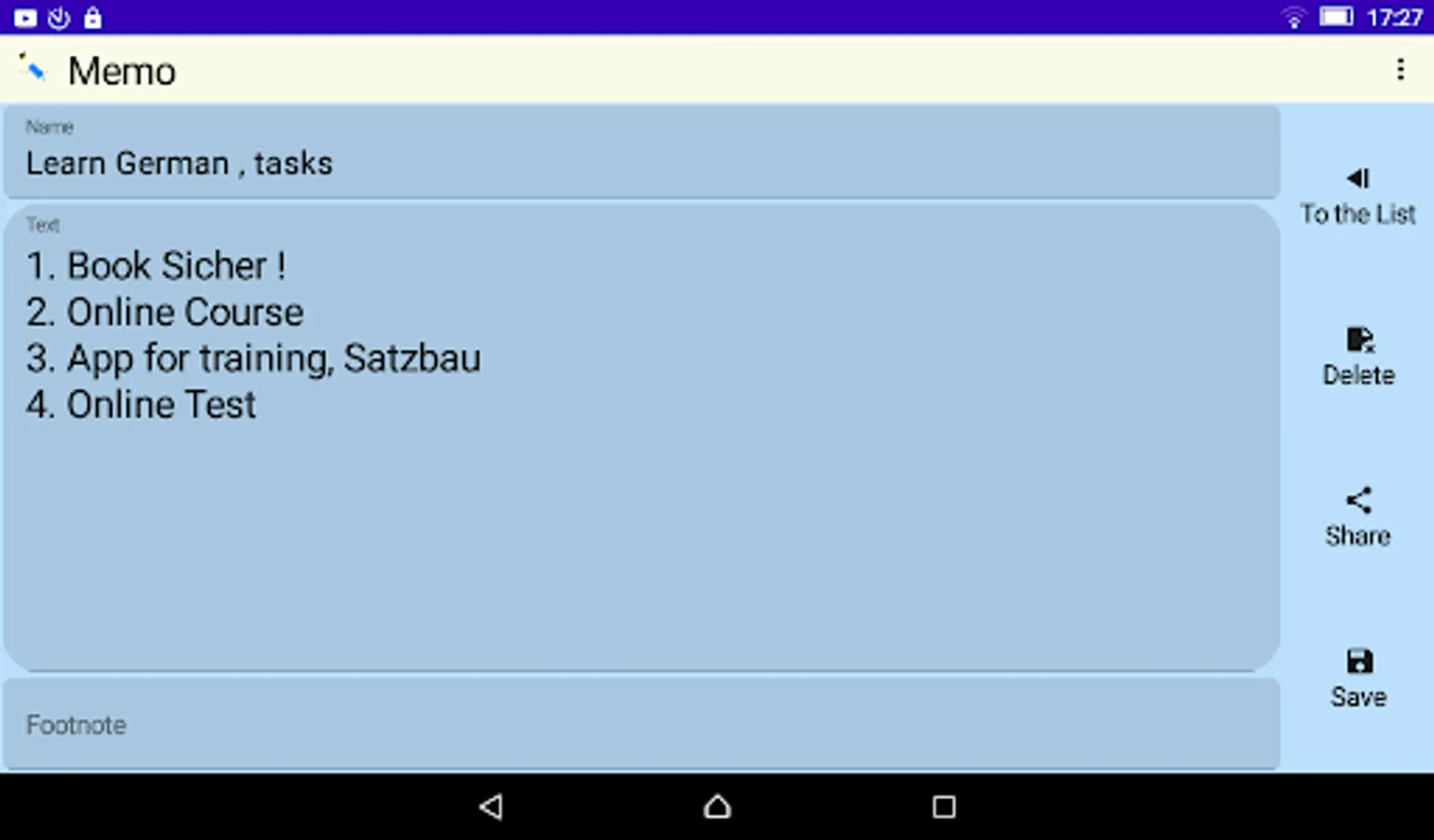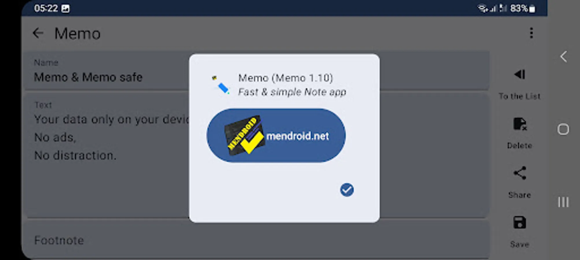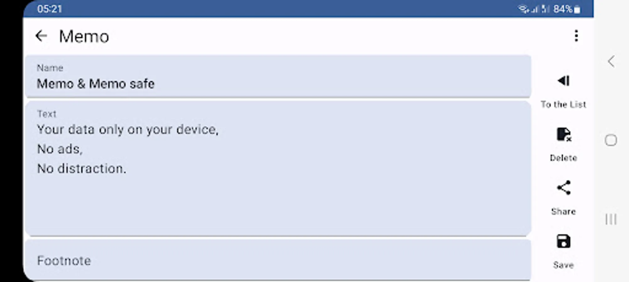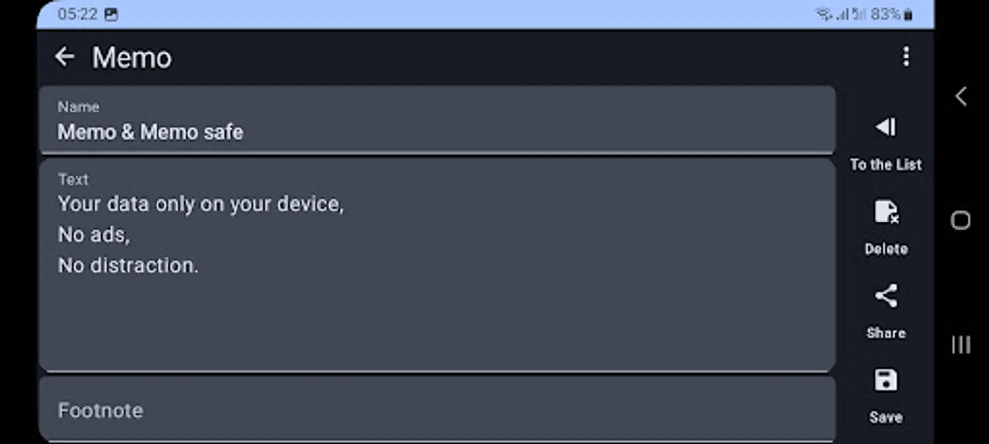 A simple Note App, provides tools to type, save and retrieve text from your Android device. No ads, no extra features, no distractions. Just type, save, read and delete your own notes when you need or when you want.