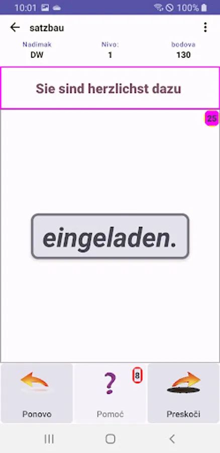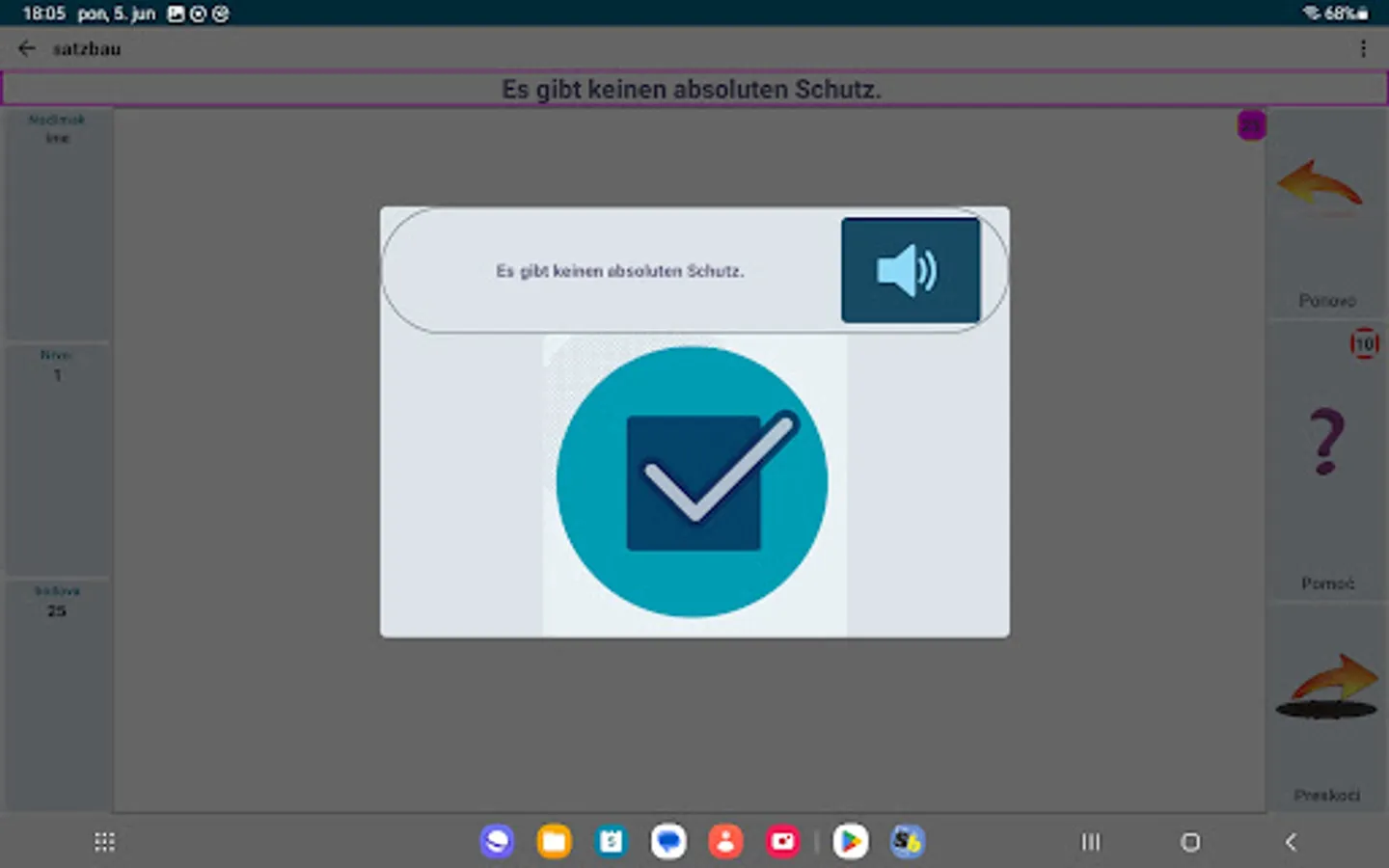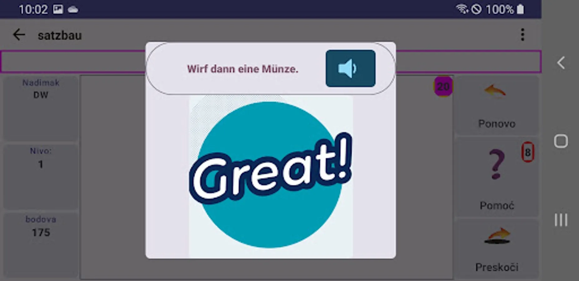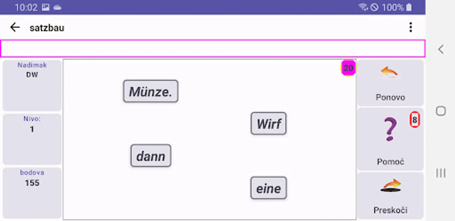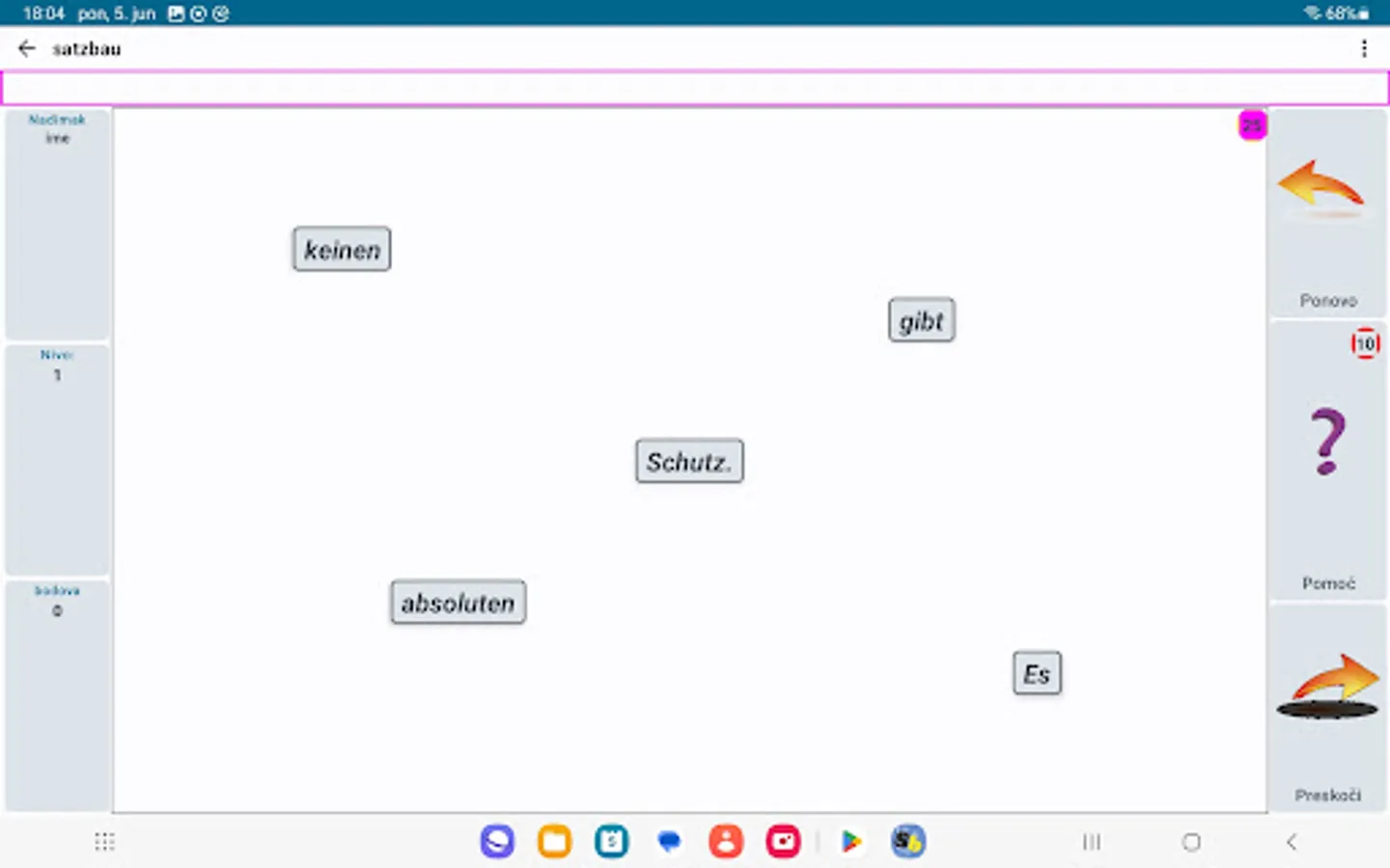 Satzbau is an Android app that tries to teach you the basic rules of sentence construction in German. Of course, there is no app that can make you learn a language, but it can help.