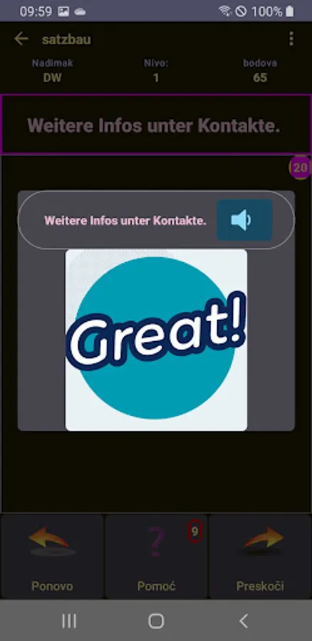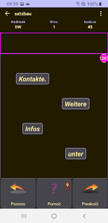 All sentences are grouped by difficulty into 9 levels. You start with simple sentences at the first level and work your way up through the exercises. If you are good at building sentences, then you will earn more points and skip the easy beginner levels very quickly. If, on the other hand, you have to repeat yourself a lot or construct your sentences incorrectly, then you will earn a low number of points and should probably work harder at the beginning.