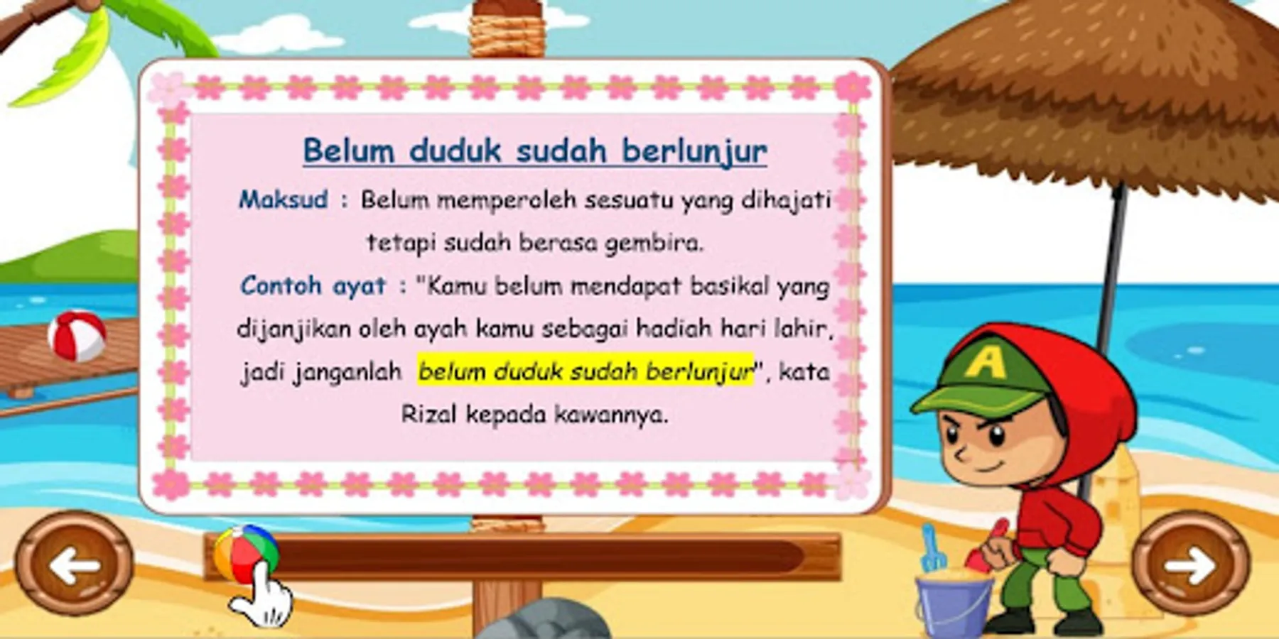 The purpose of this application developed is to focus on Games and Learning Malay Proverbs for Primary Schools Year 1 to Year 6 developed to innovate in terms of Education, Community Development and Social Innovation. This application is a game -based learning application on Malay proverbs that is able to attract the interest of students and the current generation. In addition, the purpose of this application developed is to increase awareness among students about the importance of Malay proverbs. In addition, this application can also help students to strengthen their understanding of Malay proverbs learned in school.