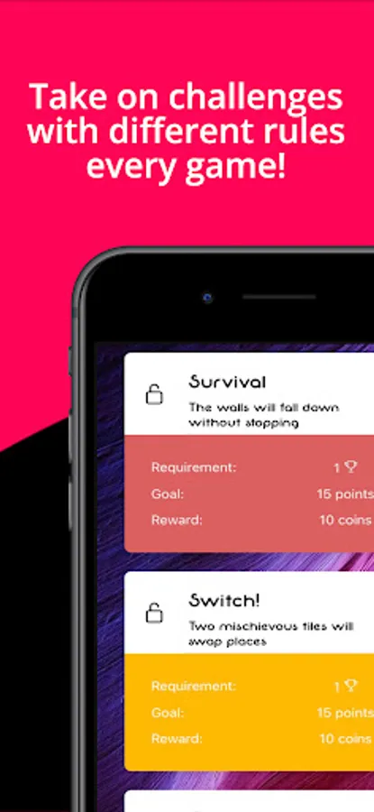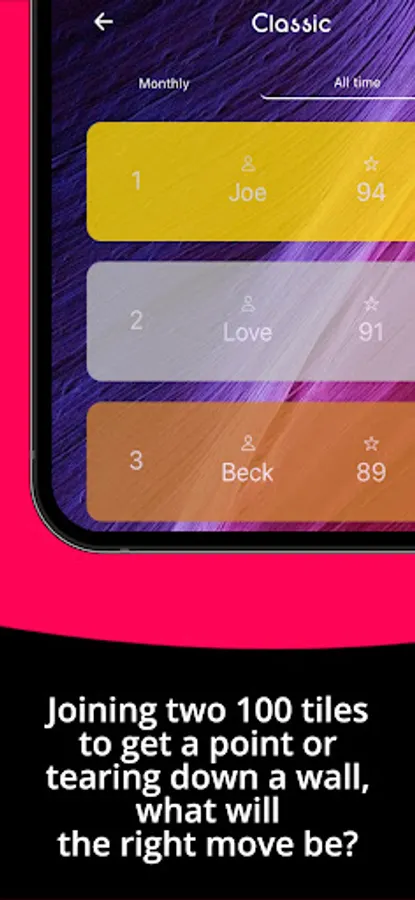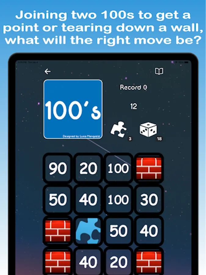 Swipe adjacent tiles towards each other to sum their values, join a pair of 100 tiles and get a point. Too easy? No, because between moves, brick walls form to hinder your game. Does it seem too difficult now? Don't worry, there are also puzzle tiles that transform each tile they are moved onto into a 100 tile, that you can then use to break down walls or score points.