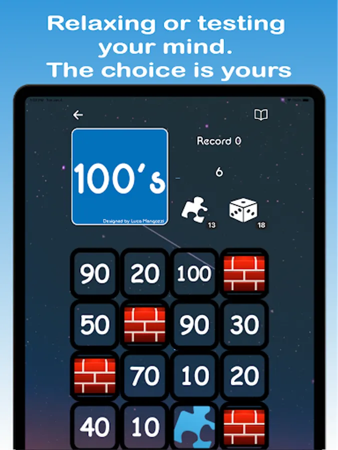 If you need help, you can resort to puzzles and dice outside the game grid. The puzzles turn a tile of your choice into a 100 tile, the dice randomly reshuffle all the tiles in the game grid.