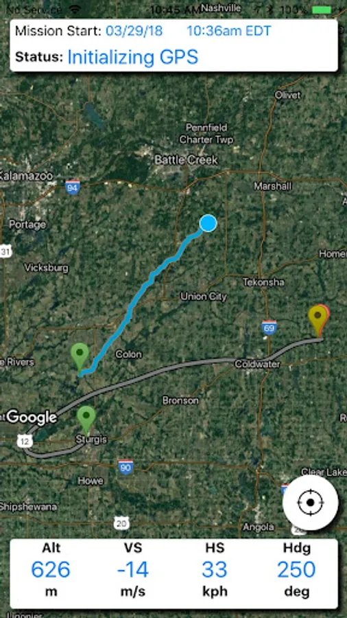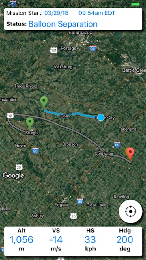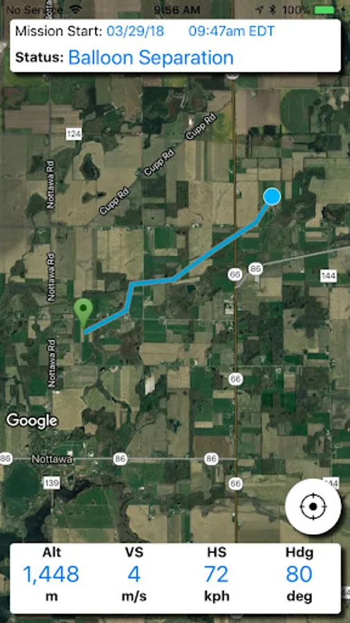 - Displays a green pin for launch location, a yellow pin for balloon burst location, and a red pin for landing location.