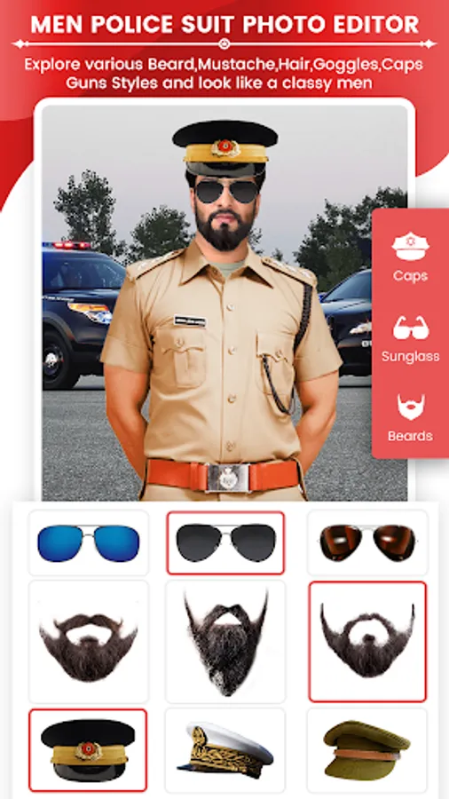 Men Police photo suit Editor Set is all country Police officers Photo Suit set. Policer is all in one Police Photo Suit Montage with Police Set, Police Caps, Police powerful Weapons, Police Cars, bikes and Choppers. Policer also has as a men Makeup features in which you can try different Beard Styles, Hair Styles, Mustache Styles and Sunglasses.