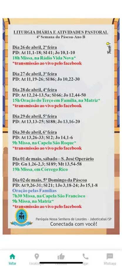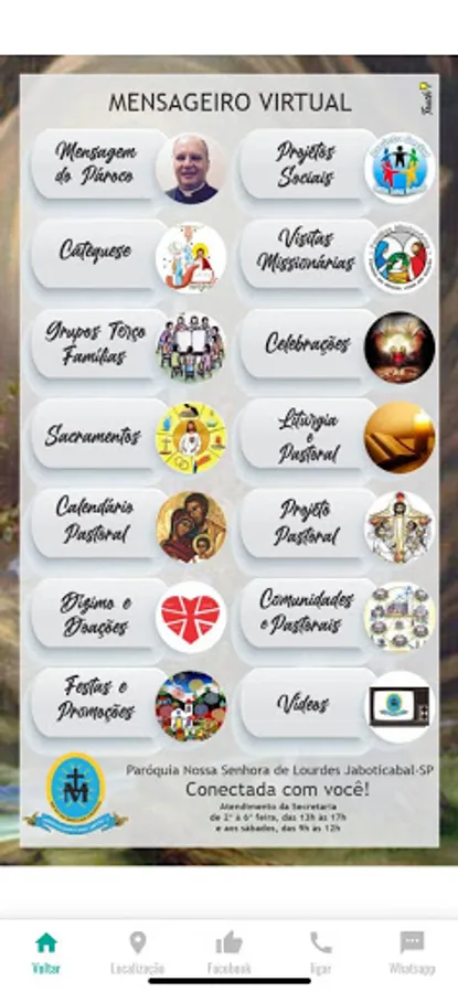 However, it is very important to keep in touch with our Church, to seek spiritual comfort, hope ... Thinking about it, we present '' VIRTUAL MESSENGER ''. With it, it will be possible to take all the information of our Parish to you ... and with a simple touch on the screen of your cell phone, you will be able to access the subject of your interest.