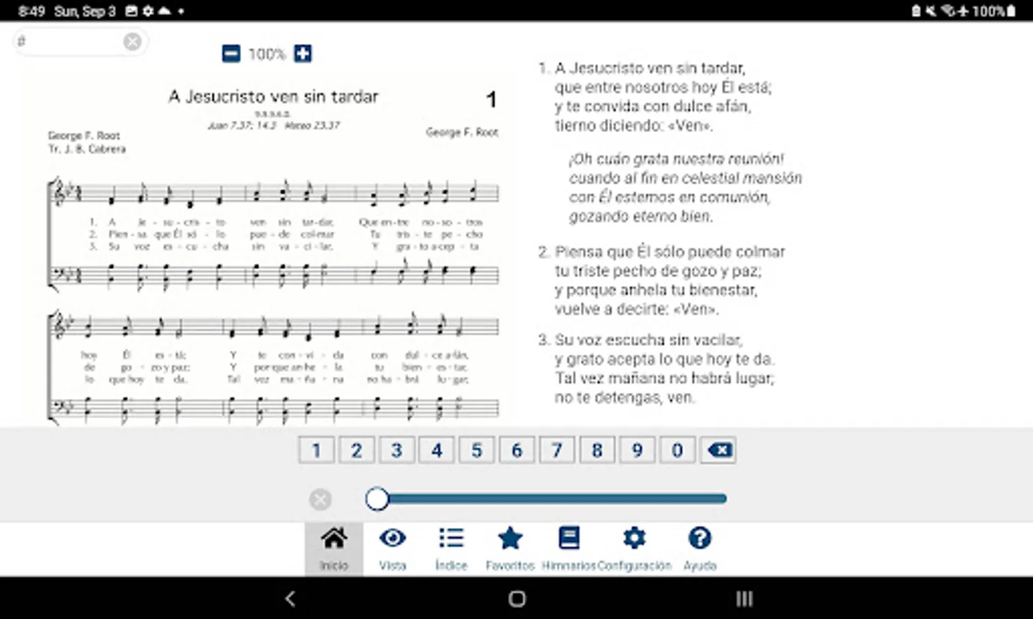 It has music and sheet music for some hymns (by Miguel Mosquera) but you need an Internet connection to listen to the music.