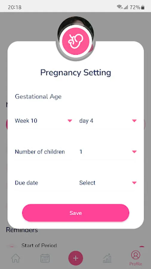 • Easily switch from menstrual cycle tracker to pregnancy mode or vice versa.