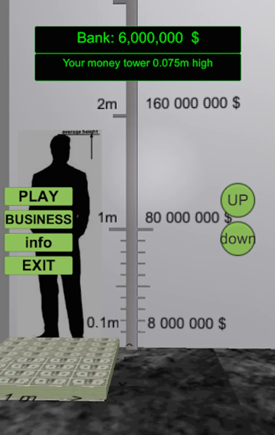 Game bank is for money tower. It is 1m x 1m and as high as your game score. For example, real money cube 1m x1m x 1m could cost more than 80M $. Yes, it is a real capitalism.