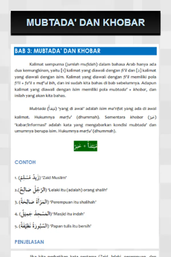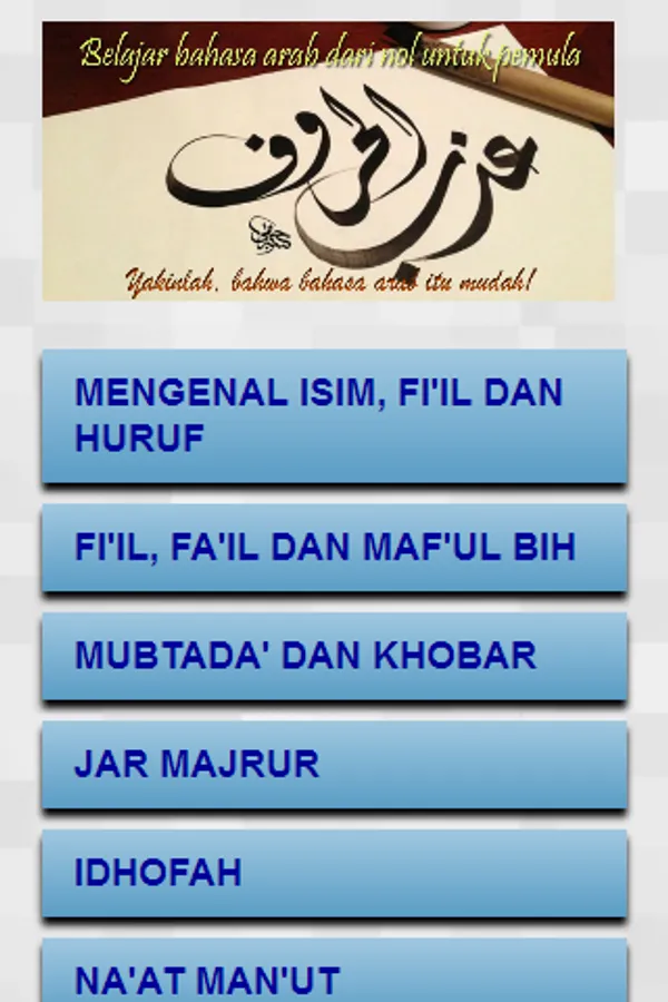 This application is developed for anyone who wants to learn Arabic on the basis of zero or has not been completely studied Arabic. This application contains the most basic things with a simple expression, compact, and lightweight to be understood by a layman kelangan. Discussed in a simple and concise, with no long-winded. So that will guide you to learn Arabic with ease and brevity.