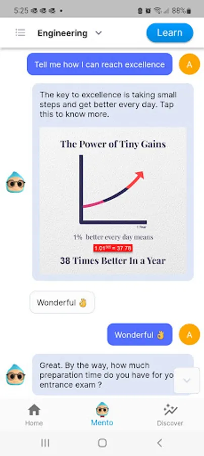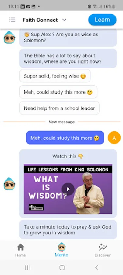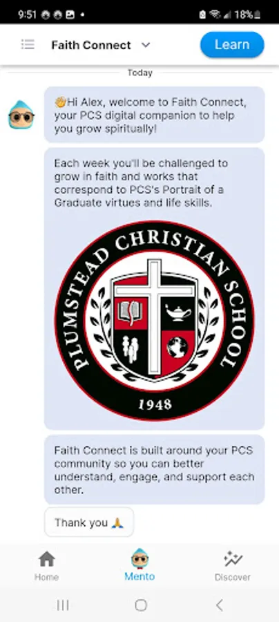 This app is a personal learning companion for students to help them reach their next milestone. The app uses an AI chatbot to deliver small-sized learning, continuous engagement and behavioral motivation to help students progress towards their goals. The app supports academic, faith-based and social-emotional learning.