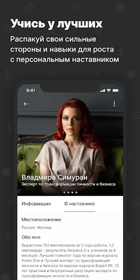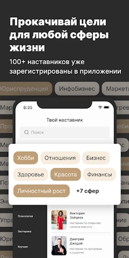 In the application you will find a mentor for pumping any area of life. To do this, you just need to go through a short registration, get to know experts from 14+ personal and professional areas of development, choose mentors by experience, cases, cost or format of consultations and be in touch with them at any time in one place - your smartphone.