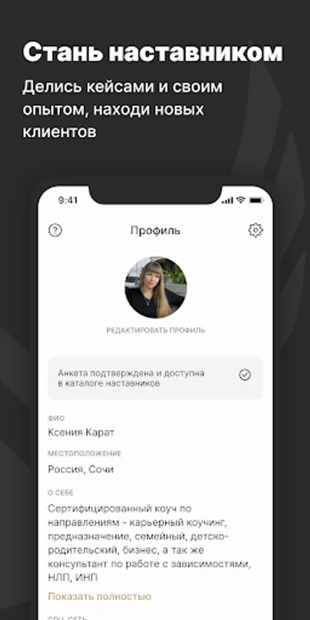 Register in the "Your mentor" application, fill out your profile in detail, tell us about the area in which you have experience, tasks solved and successful cases, and your profile will be published among the best mentors from 14+ areas of development!