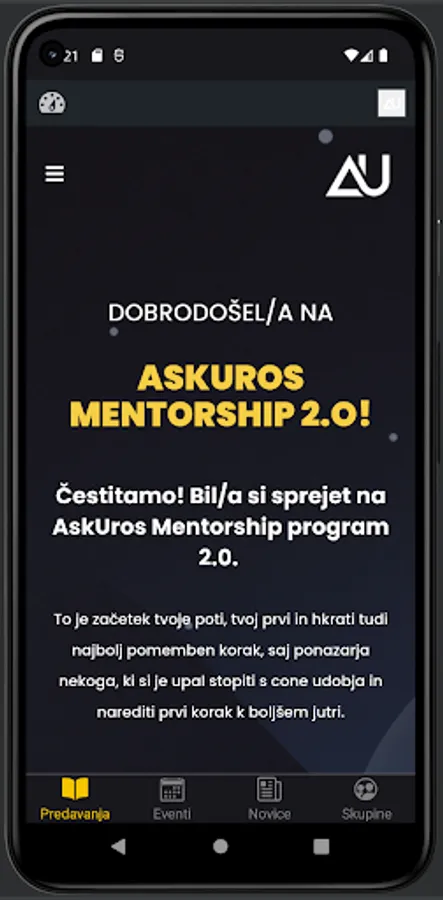 Uradna aplikacija za AskUros Mentorship program. Na aplikaciji boste lahko spremljali celoten Mentorship program, se prijavili na evente, se pogovarjali s sošolci in pletli nove poslovne vezi.