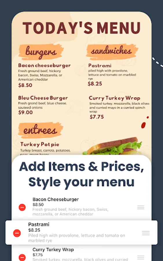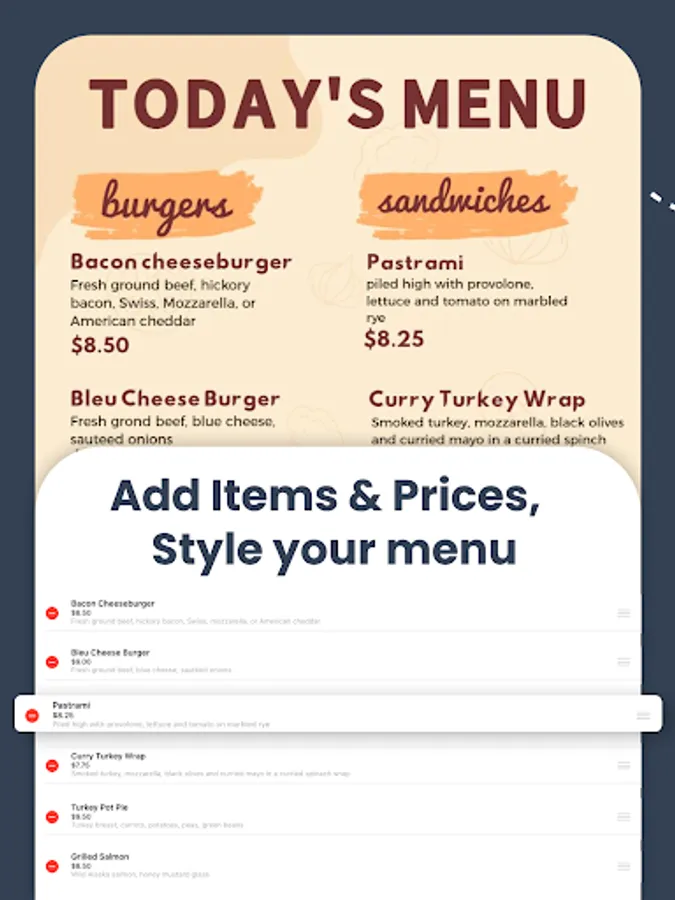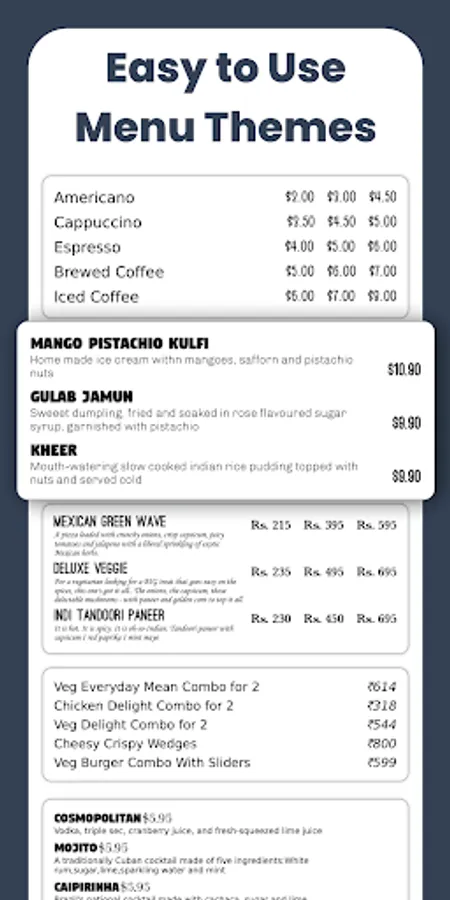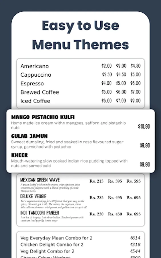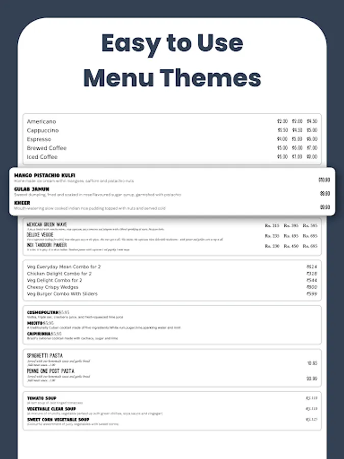 Create a menu for your cafe or restaurant with a menu maker. Customize menu templates. Quick & Easy to Use. No menu card design skills are needed.