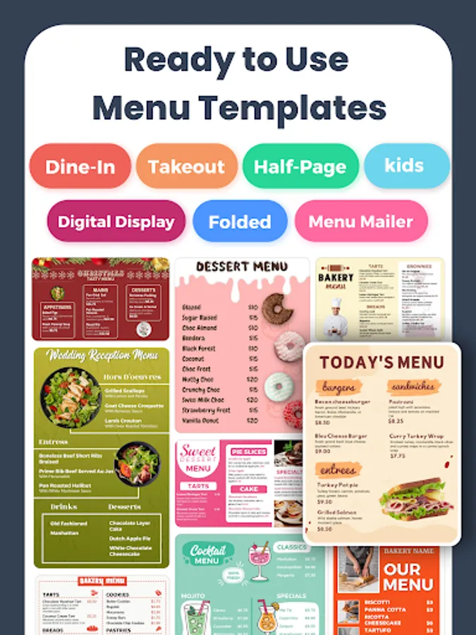 The menu maker app is useful for all businesses that have a list of products & services and want to show it to their customers in a creative way. It is also useful for graphic designers who want to create menu designs quickly.