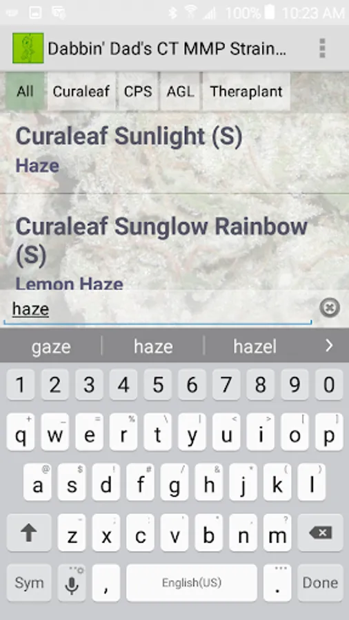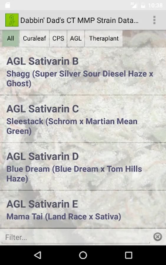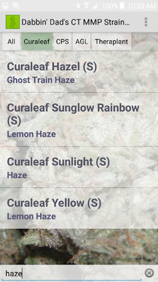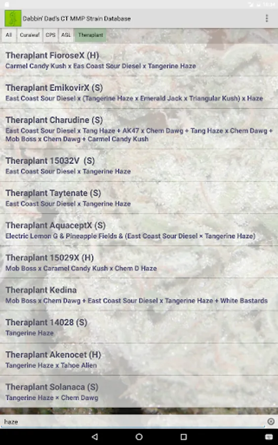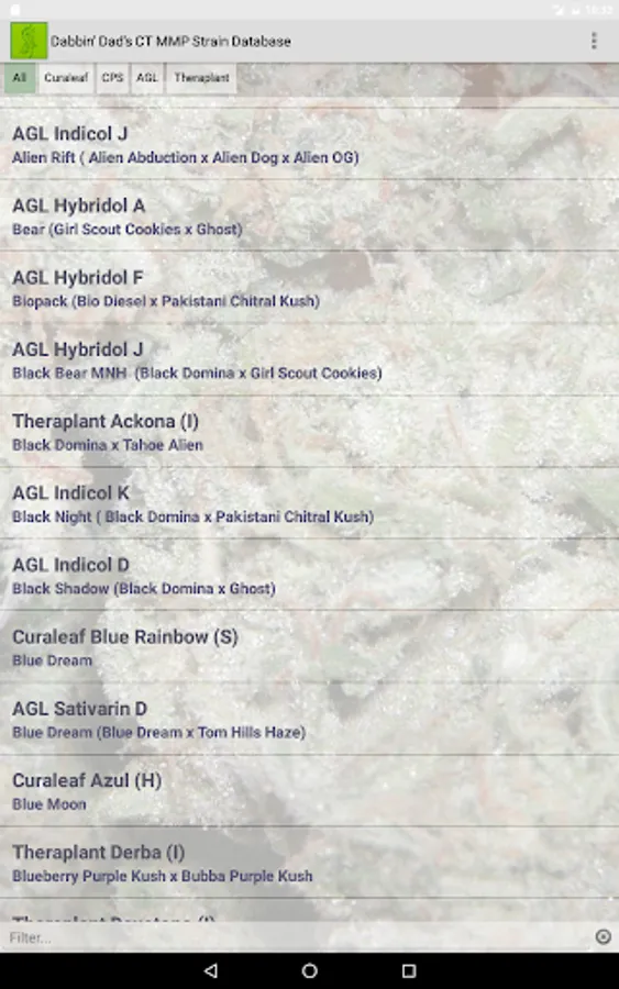 Thanks to Dabbin' Dad's hard work putting together this data, this app is available to you. It is very simple, just a list of strains and a simple text filter. What makes it great is that data it contains. It makes it easy to quickly look up the common name of a strain using your phone.