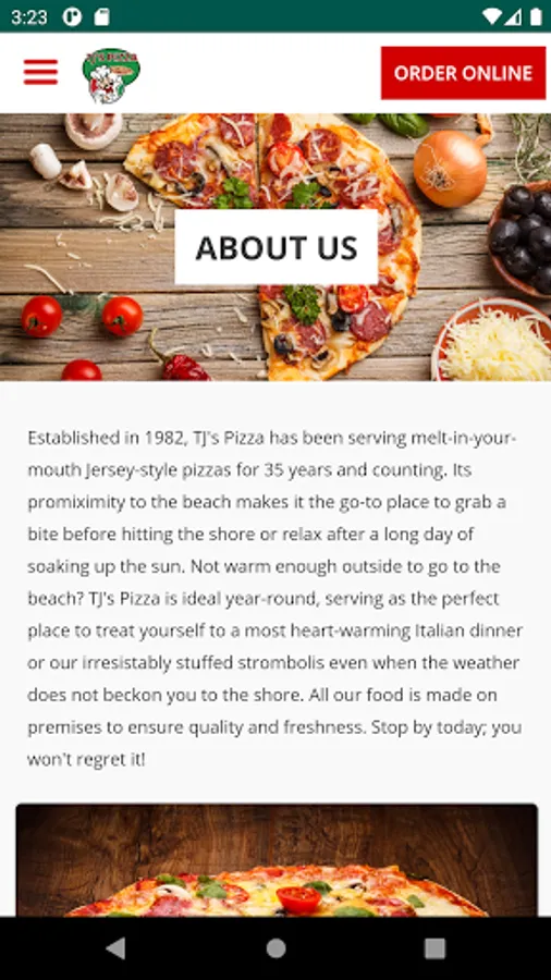 Not warm enough outside to go to the beach? TJ's Pizza is ideal year-round, serving as the perfect place to treat yourself to a most heart-warming Italian dinner or our irresistibly stuffed strombolis even when the weather does not beckon you to the shore.