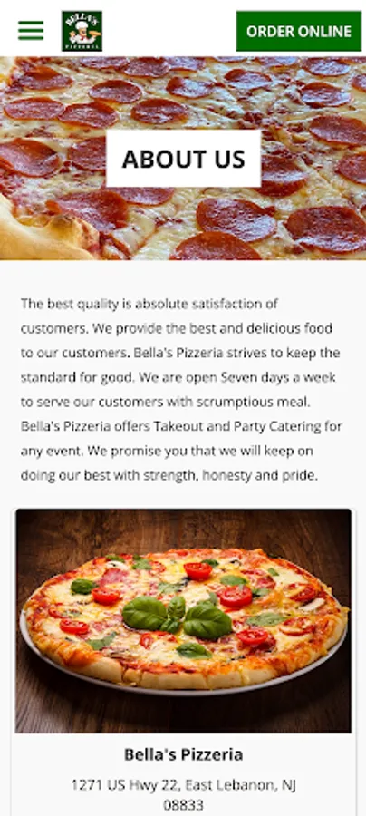 We provide the best and delicious food to our customers. Bella's Pizzeria strives to keep the standard for good. We are open Seven days a week to serve our customers with scrumptious meal. Bella's Pizzeria offers Takeout and Party Catering for any event. We promise you that we will keep on doing our best with strength, honesty and pride.
