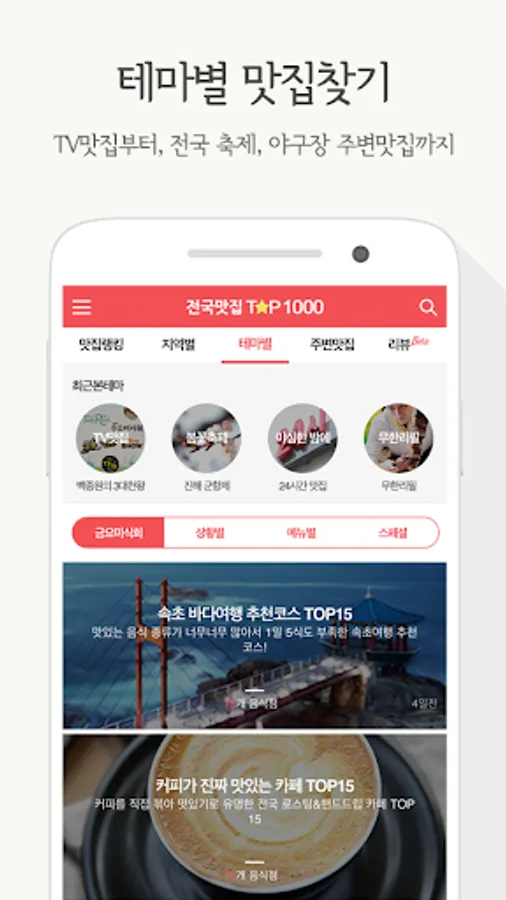 전국맛집 TOP1000은 전국각지의 모범음식점 1만개중 지자체 인증 + 지역 현지인 추천 + 파워블로거 100인의 추천을 통해 선정한 국내 최초 실시간 전국 진짜맛집랭킹 어플입니다!