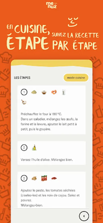 Mark the recipe pages, convert the quantities according to the number of parts, gather the ingredients and make the shopping list... The Menuz application is there to take care of all that is laborious!