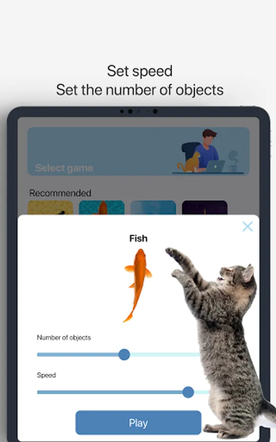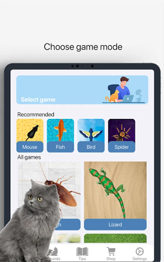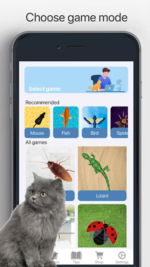 - Choose cat game mode: mouse for cats, fish, laser, bird, butterfly, ladybug, cockroach, spider, lizard, fly, string