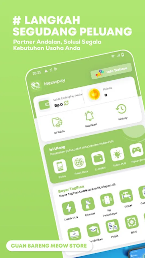 Meow store is a digital application that provides digital products such as buying game vouchers, topping up pulses and data packages as well as e-wallet top up pln tokens with low admin fees.