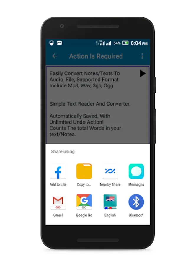 Easily Convert Notes Or Texts To Audio File. Supported Format are: Mp, Wav, 3gp, Ogg