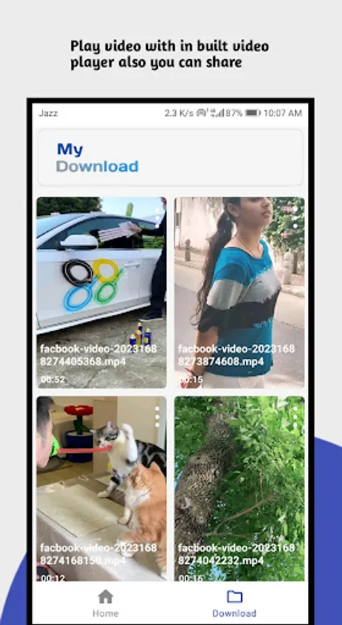 Imagine you are on the feed of Facebook and interested in a video, you want to save the video and watch offline , or share with your friends, or repost to other social medias. Then how?you just need to click the video and copy link of video you like. It is super easy and fast. Your video will be in Downloads tab soon. You can play it whenever you want or share to others.