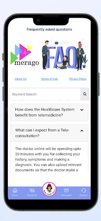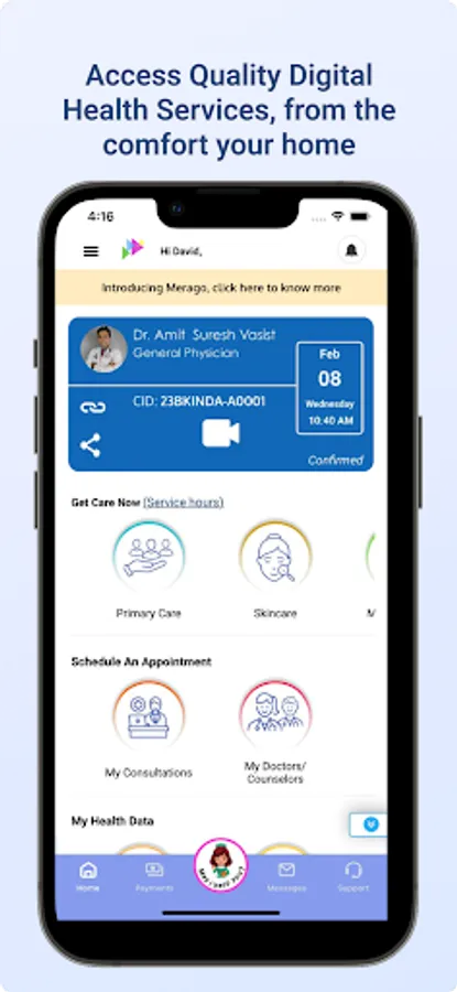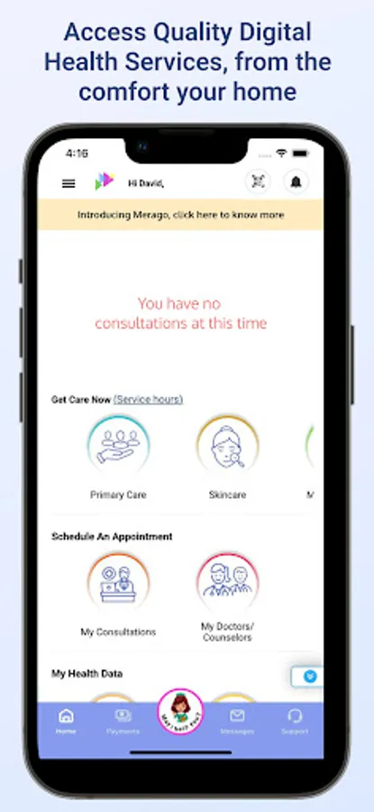 Request an on-demand consultation: Login the Merago app and select either primary care or a specialty care center you need. Pay the required fee or any co-pay if you have a supported insurance.