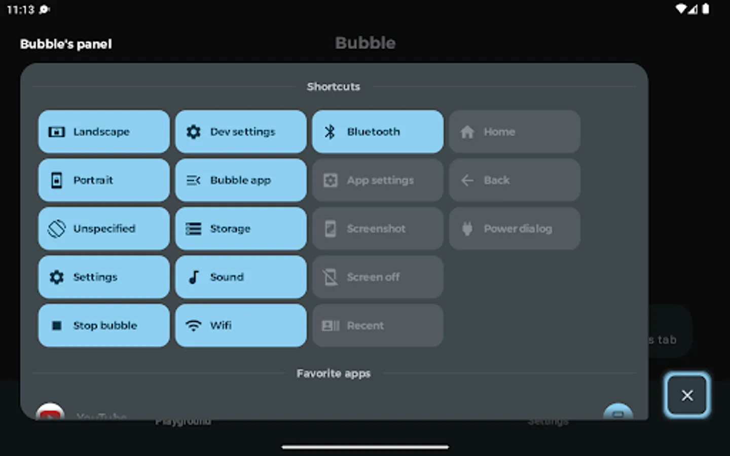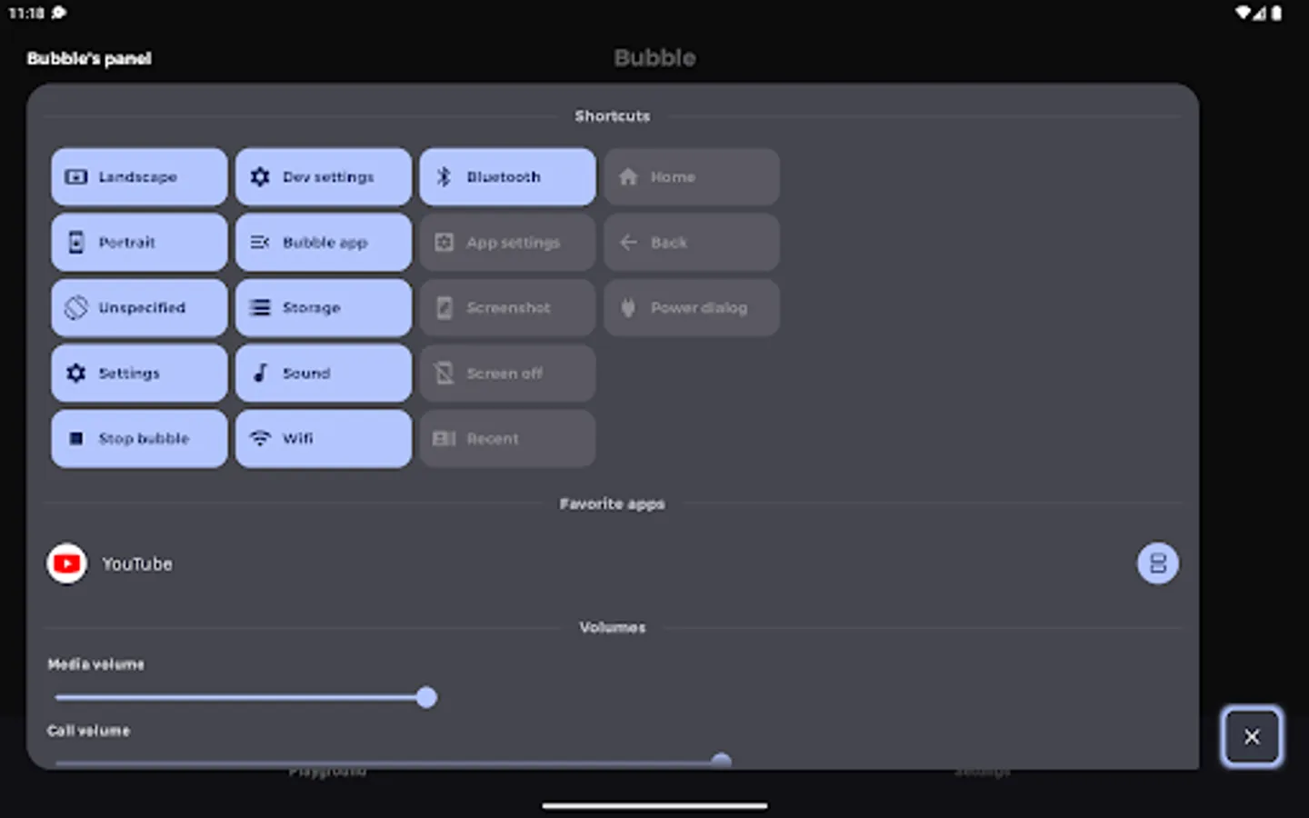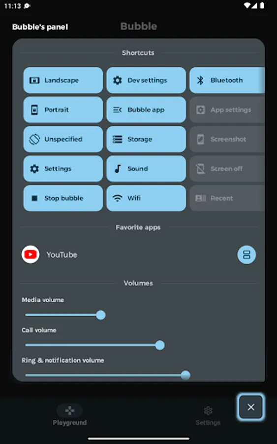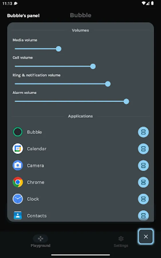 - Overlay permission ("SYSTEM_ALERT_WINDOW" and "ACTION_MANAGE_OVERLAY_PERMISSION"): Be able to display over other application. This permission is required for the bubble and panel to be over other applications.