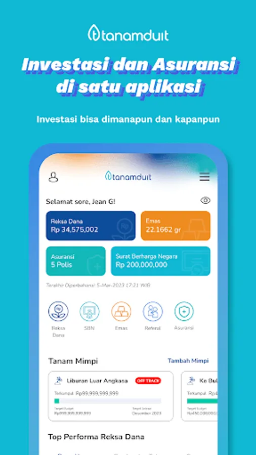 tanamduit adalah aplikasi investasi reksadana, Surat Berharga Negara (SBN), emas dan asuransi. Kamu bisa mulai investasi aman dan praktis sesuai kebutuhan dan tujuan keuangan.