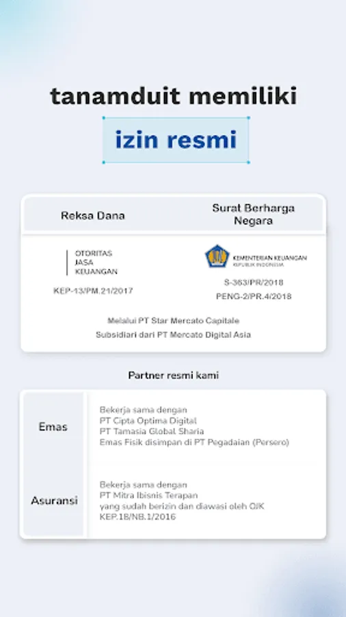 tanamduit memiliki lisensi sebagai APERD dari OJK dan menjadi Midis SBN resmi dari Kementerian Keuangan Republik Indonesia. Login aplikasi aman tanpa ribet dengan sistem autentikasi biometrik.