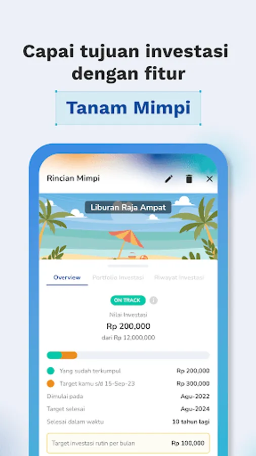 Buat mimpimu, tentukan target impian, dan mulai investasi rutin sampai capai tujuan. Dapatkan perhitungan nominal investasi rutin, tips perencanaan keuangan, rekomendasi reksadana terbaik, potensi hasil investasi hingga reminder investasi yang terkoneksi dengan Google Calendar. Ada juga fitur “on-track” dan “off-track” untuk pantau perjalanan target investasi.