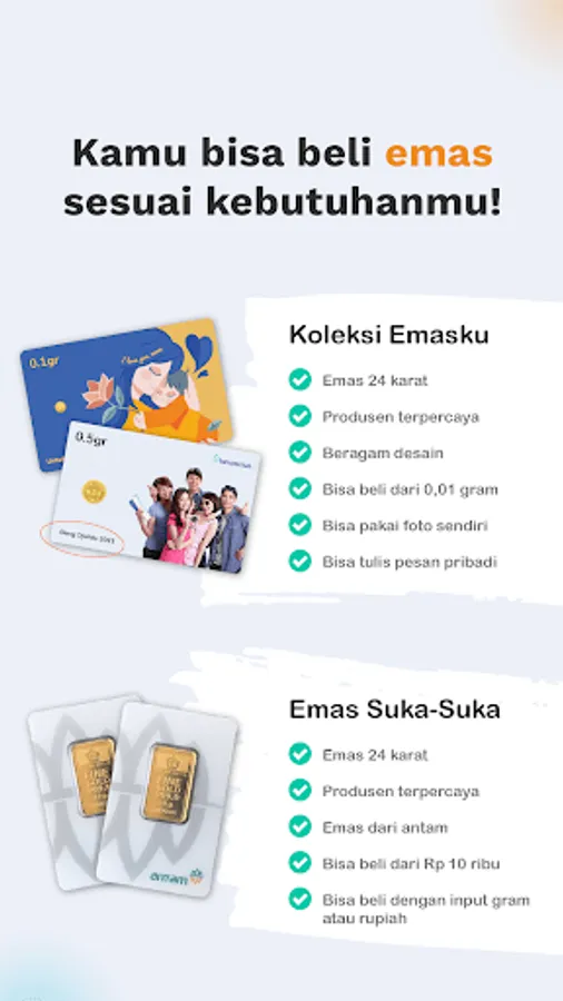 Mau kasih hadiah emas untuk acara ulang tahun, pernikahan, wisuda, arisan, gathering acara kantor, atau acara spesial lainnya? Koleksi Emasku tanamduit solusinya! Cetak emas pakai desain sendiri juga bisa. Pesan emas, cetak dan dikirim selamat sampai tempat tujuan!