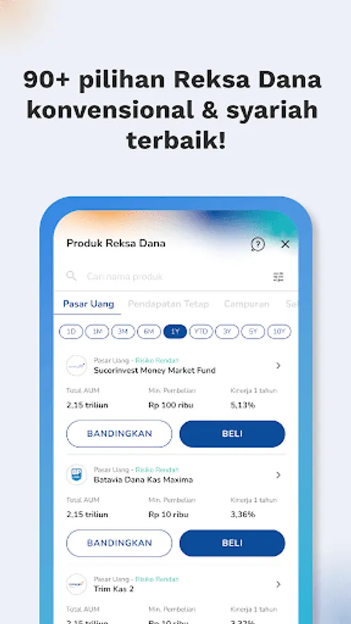 Ada top performance reksadana di beranda dan fitur bandingkan reksadana. Kamu bisa bandingkan 3 produk reksadana sekaligus dan lihat performanya langsung di aplikasi. Pantau kinerja portofolio investasi langsung di beranda.