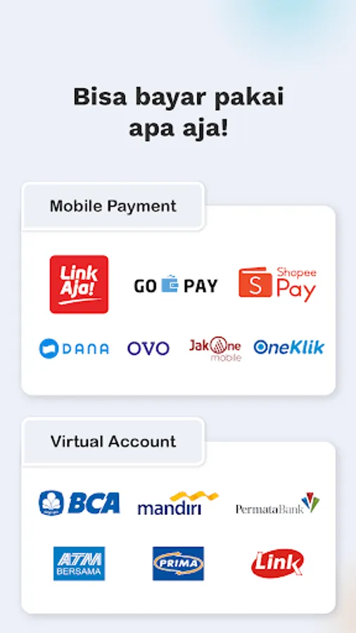 Bisa bayar pakai GoPay, LinkAja, DANA, ShopeePay, OVO, BCA OneKlik, JakOne Mobile, atau Virtual Account. Beli reksadana juga bisa pakai Bank Transfer.
