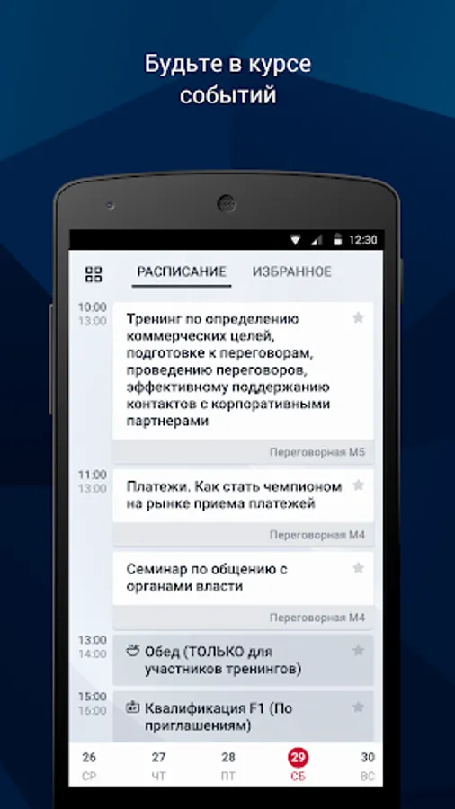 Participants of conferences can view the schedule of events, create meetings with colleagues and pass questionnaires of speakers.