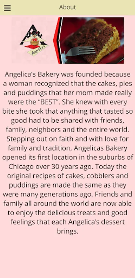 Angelica’s Bakery was founded because a woman recognized that the cakes, pies and puddings that her mom made really were the “BEST”. She knew with every bite she took that anything that tasted so good had to be shared with friends, family, neighbors and the entire world. Stepping out on faith and with love for family and tradition, Angelicas Bakery opened its first location in the suburbs of Chicago over 28 years ago. Today the original recipes of cakes, cobblers and puddings are made the same as they were many generations ago. Friends and family all around the world are now able to enjoy the delicious treats and good feelings that each Angelica’s dessert brings.
