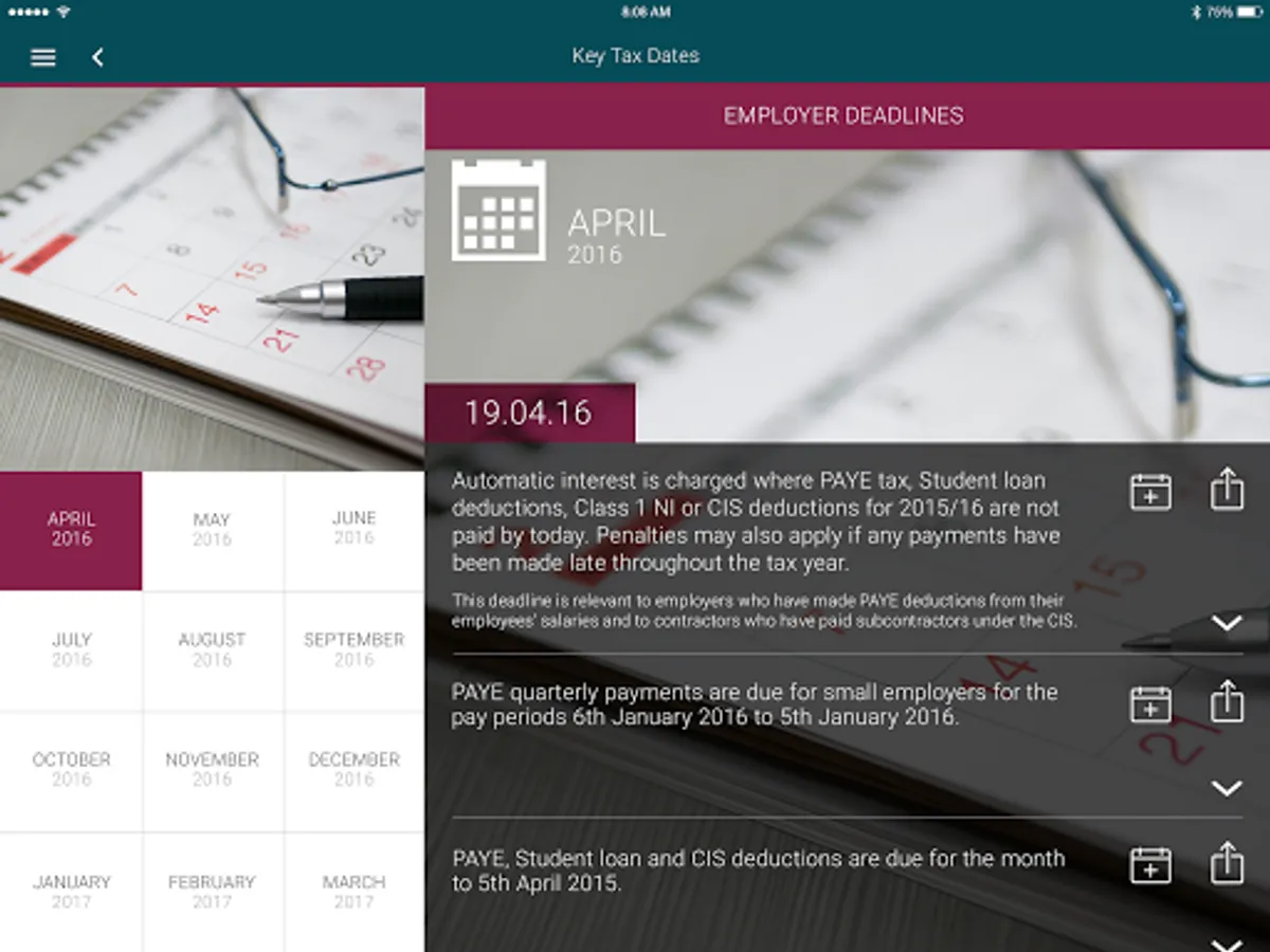 The Kay Johnson Gee TaxApp has been developed with professionals and business owners in mind. Our TaxApp has been designed to provide a reminder of key tax rates and give convenient access to a range of useful tax calculators in one App. The application also summarises the key taxes with useful tips and a roundup of relevant business news each month.