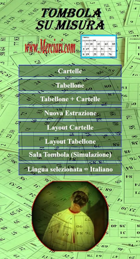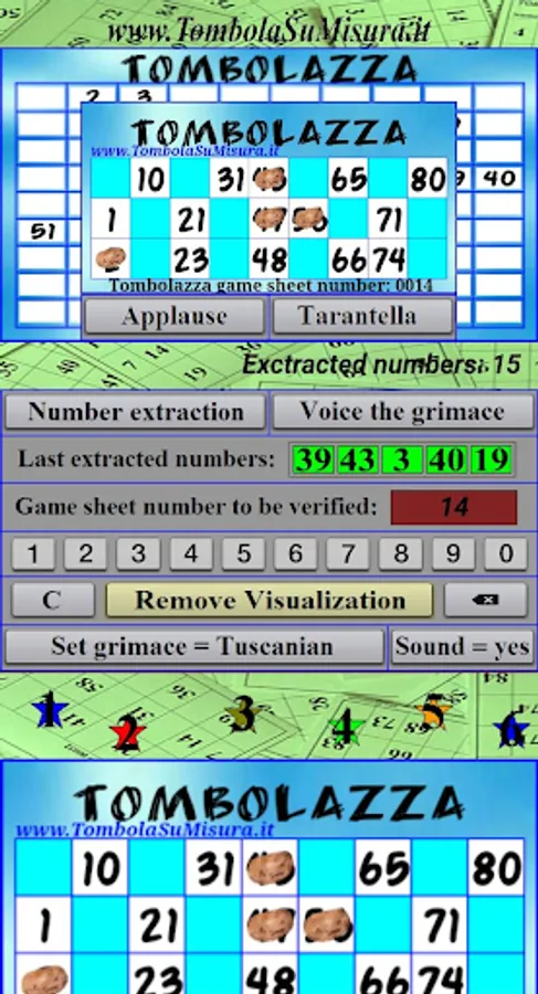 "Tombola su Misura" pronounces the released numbers and their relative grimaces (Tuscanian and Neapolitaine), both in Italian and in English and includes 2 sound effects (Applause and Tarantella).