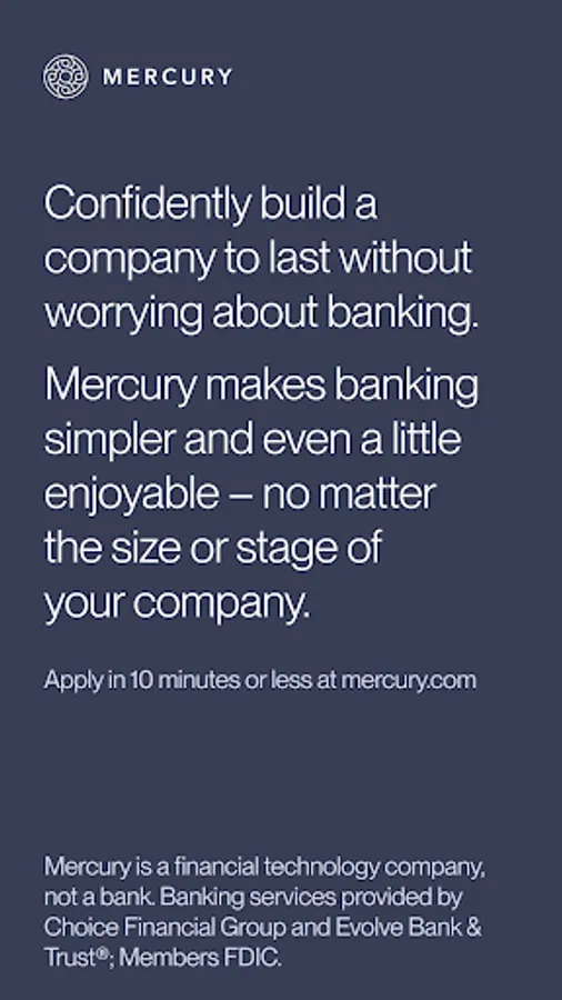 Mercury offers banking* for startups — at any size or stage. With an intuitive product experience, founders can access banking, credit cards, treasury, venture debt, and more — and manage their business with confidence. Launched in 2019, Mercury is trusted by more than 80,000 startups. To learn more, visit mercury.com.
