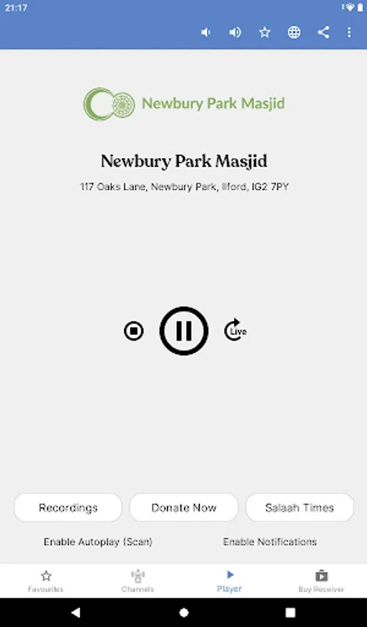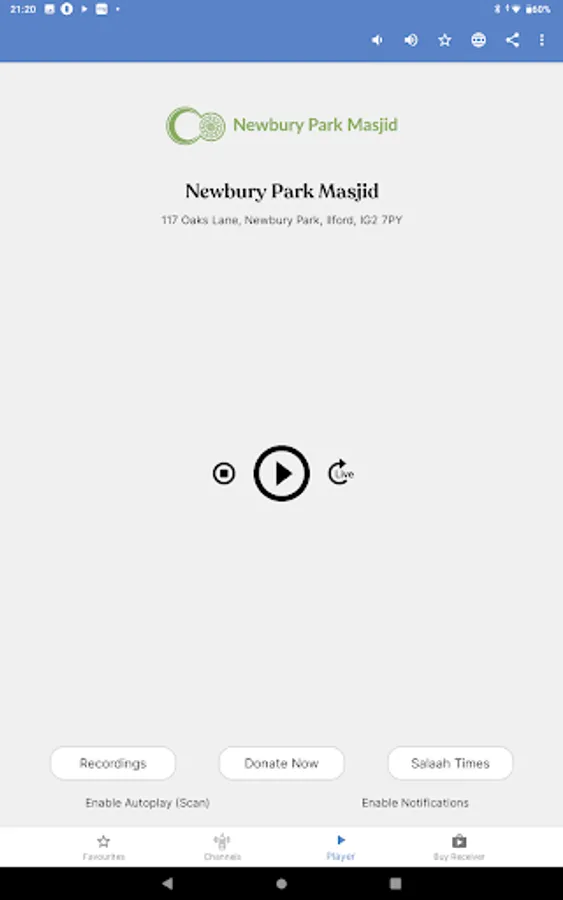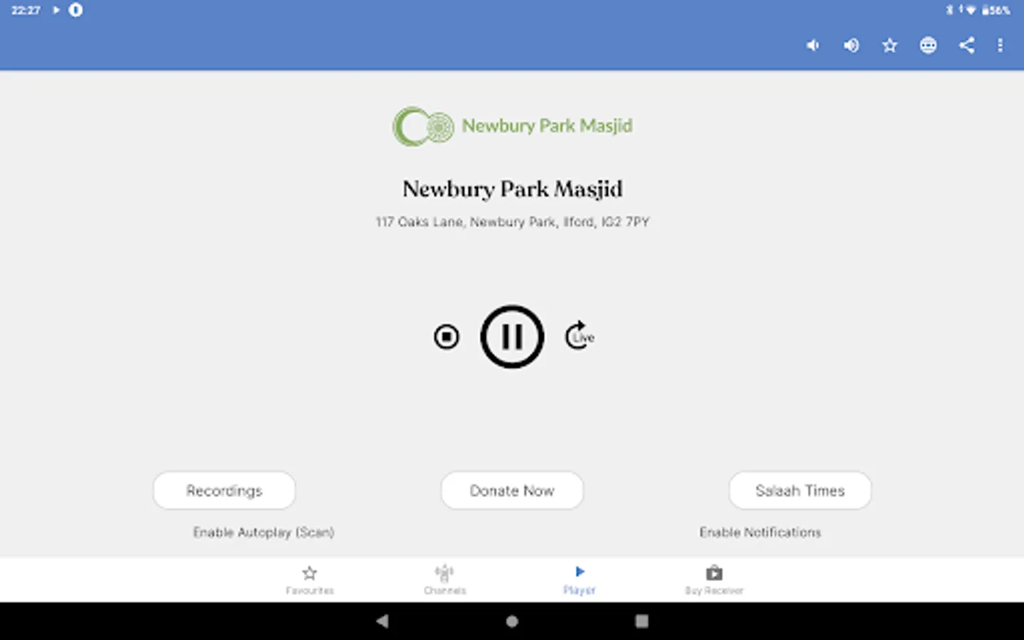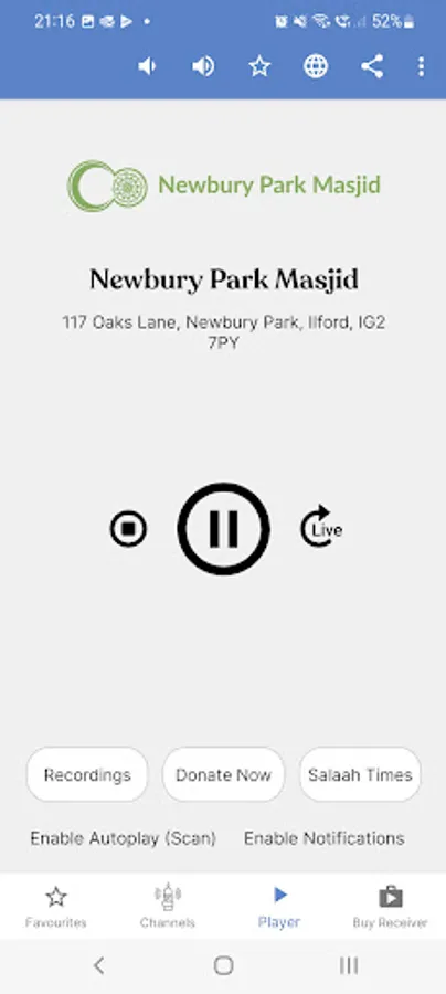 iMasjid Live can be set to scan (autoplay) when your preferred Masjid(s) channel comes online (e.g. azaan/talk). This requires a licence which will need to be purchased from iMasjid Live.