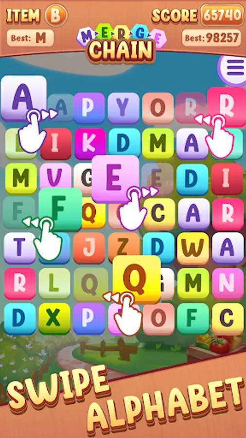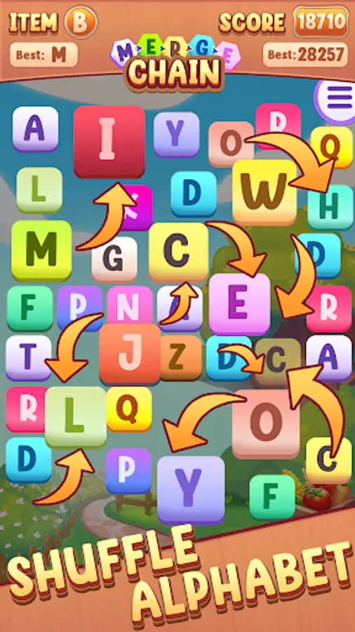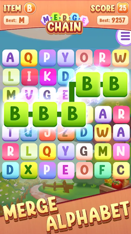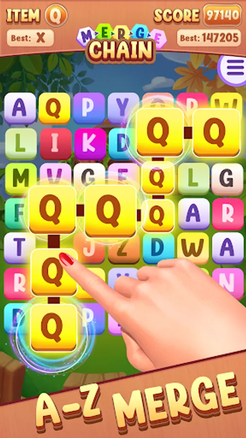 🔠 Merge chain blocks strategically to reach the last alphabet and complete the puzzle.